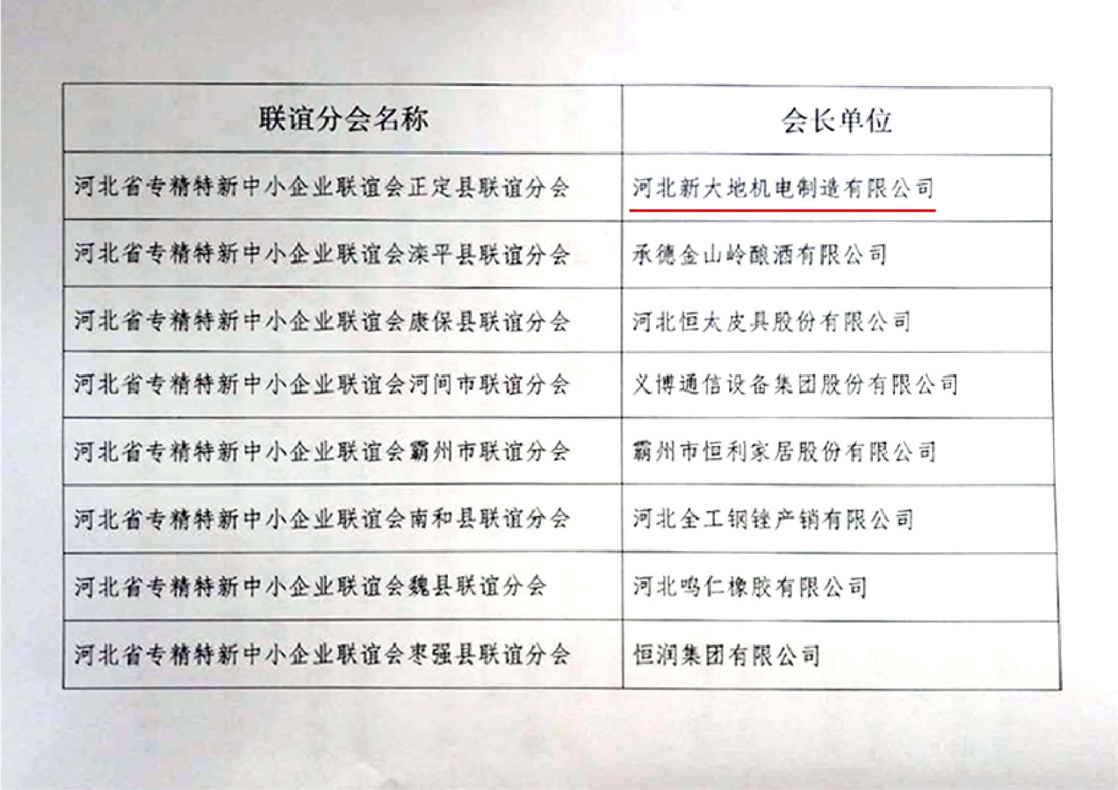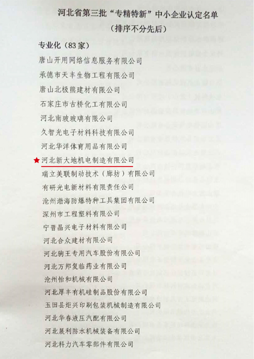 河北新大地機(jī)電制造有限公司 通過河北省第三批“專精特新”中小企業(yè)認(rèn)定