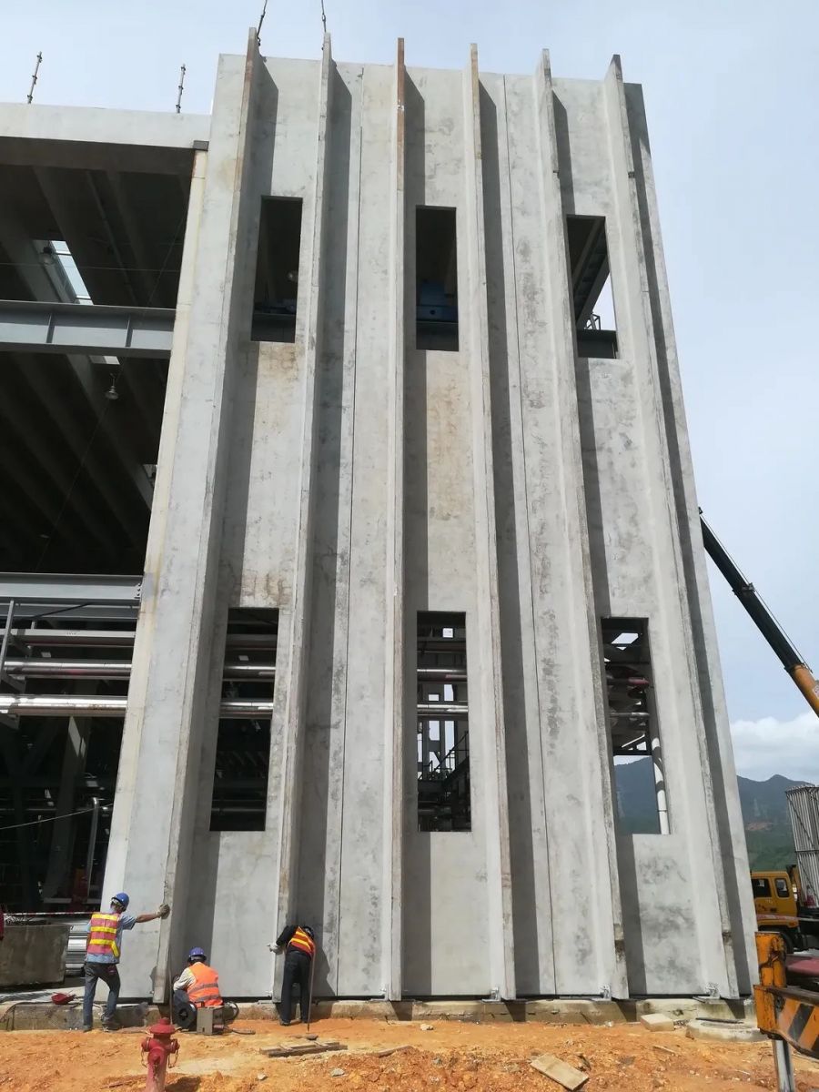 在園區(qū)建設(shè)過程中采用PC自建PC,廠房建設(shè)與生產(chǎn)線建設(shè)幾乎同步進(jìn)行,完美詮釋了設(shè)計—生產(chǎn)—施工一體化的模式。本項目PC廠房采用全預(yù)制混凝土構(gòu)件進(jìn)行建造,包括自制混凝土立柱、混凝土雙T墻板、混凝土雙T屋面板等;此外,項目還采用預(yù)應(yīng)力混凝土雙T墻板和屋面板構(gòu)建多層辦公樓。